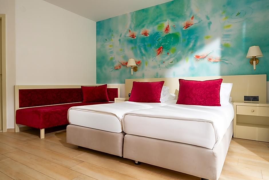 DOUBLE GARDEN VIEW EXTRA CHILD is 258 square feet and includes either a double bed 131-150 width or 2 single beds 80-130 width plus balcony, satellite tv , hairdryer, and safe.