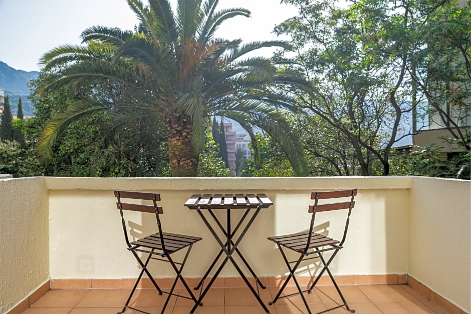 The double room offers a wardrobe, a safe deposit box, a balcony with garden views as well as a private bathroom featuring a bath.